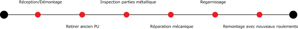 Lorsque le revêtement en polyuréthane ou en caoutchouc d’un rouleau, d’une roue ou d’une autre pièce est usé, dans de nombreux cas, cette pièce peut être remise à neuf, même si le corps métallique est également endommagé. Si une évaluation du corps métallique est requise, dès réception des pièces, un contrôle et une inspection seront effectuées et une recommandation sera faite concernant la nécessité et la faisabilité de la réparation mécanique.