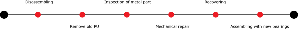 When the polyurethane or rubber covering on a roller, wheel or other part is worn out, in a lot of cases this part can be refurbished, to some extent even if there is also damage to the metal body. If an assessment of the metal body is required, upon receipt of the parts a strip & inspect will be carried out and a recommendation will be made regarding necessity and feasibility of the mechanical repair.